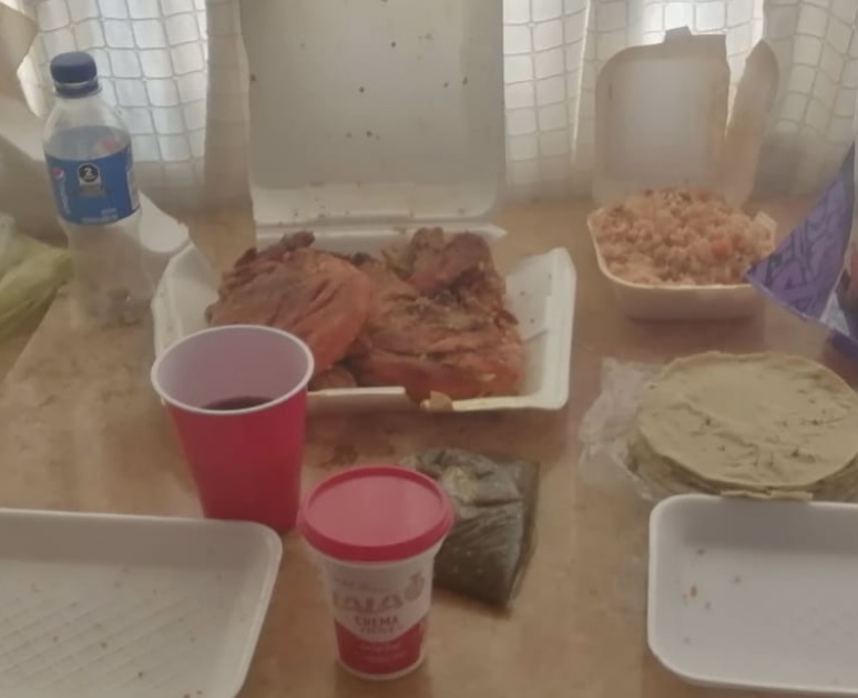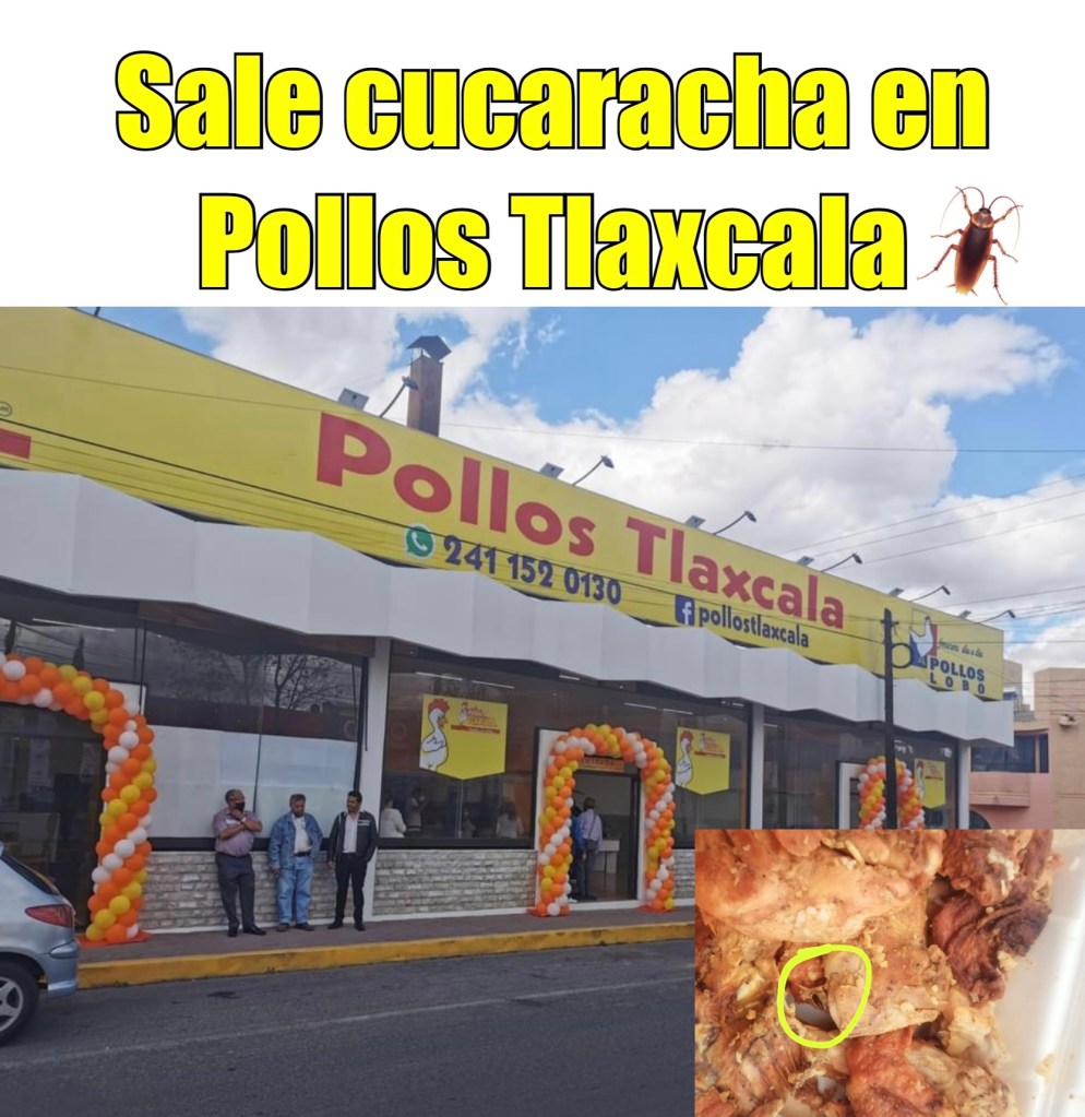 “Yo solamente pase de rápido a comprar mi pollo para alimentar a mis dos hijos y a mi esposo, en esta ocasión se me hizo un poco tarde pero logre comprar un pollo con arroz en Pollos Tlaxcala y al llegar a mi casa yo estaba sacando los platos y mi esposo abrió la bolsa y saco el pollo, arroz y tortillas d iba agarrar una pieza de pollo fue cuando el se dio cuenta de la cucaracha y de inmediato tomamos una fotografía, meti todo a la bolsa y la cerre y me dirigí al establecimiento para pedir la devolución de mi dinero y fue cuando una señorita me trato muy mal y me dijo que eso no era posible y al exigir la devolución subió el tono prepotente y me dijo que si no me iba llamaría a la policía para sacarme por la fuerza y mejor decidí irme y reportarlo para que que la gente ya no consuma esos pollos asquerosos sin medidas de higiene y seguridad y aparte con muy mal trato”